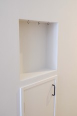 珪藻土の壁、カギフック用のニッチ、造作テレビボード、アイアン手すり、ブラックボード、